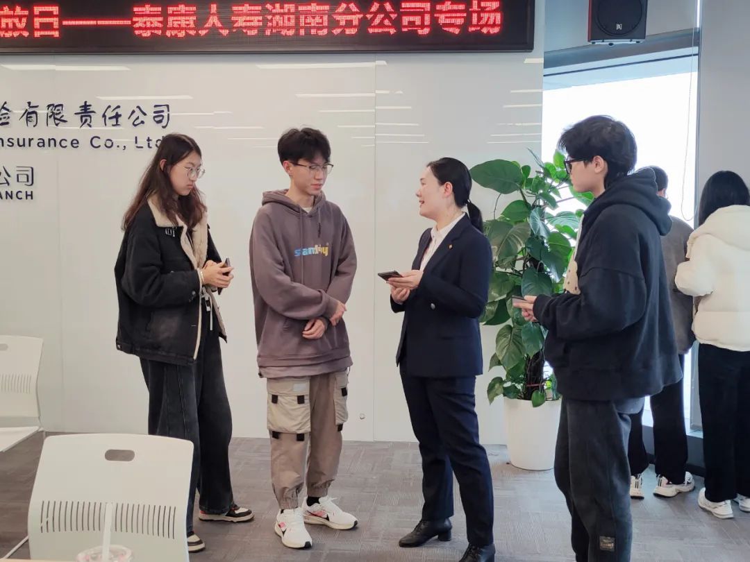 首先,同学们在体验官的带领下,参观了大健康财富体验中心。通过体验官细致的介绍与讲解,同学们深入了解了泰康人寿在健康、养老、财富管理等方面的业务和服务。随后,同学们在工作人员的带领下,参观了泰康人寿湖南分公司的职场环境,整体整洁明亮,充满了积极向上的氛围,温馨的工作位也展现了企业的人文关怀。