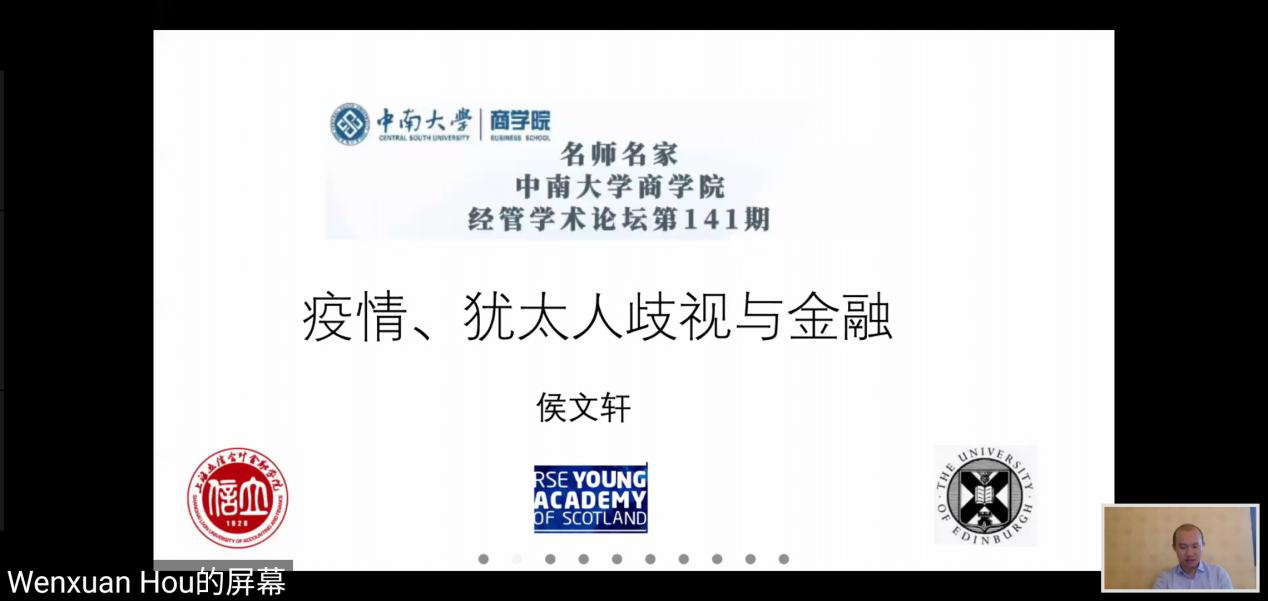 2020年7月17日上午9点,英国爱丁堡大学讲席教授、上海立信会计金融学院特聘教授侯文轩应邀通过Zoom会议软件上开展了主题为“疫情、犹太人与金融发展”的线上学术讲座。讲座由永利集团金融创新研究中心主任危平教授主持,多位教师及相关研究生积极参加并共同研讨,讲座开始前,副院长危平教授对侯文轩教授的学术成就及社会影响进行介绍,侯教授腹笥渊博、学术经历丰厚,给师生留下了非常深刻的印象。