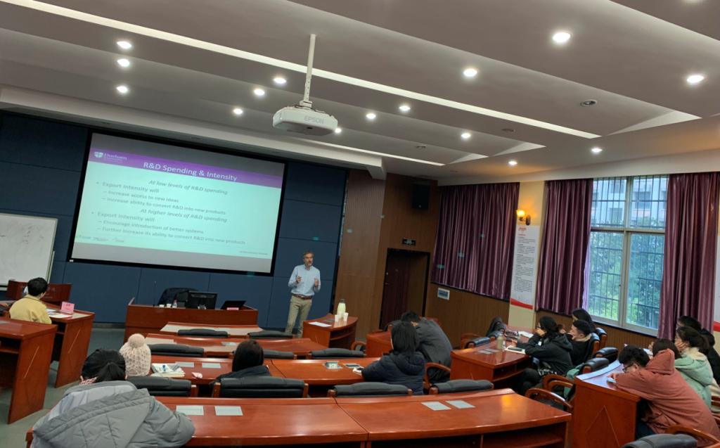 在此次讲座中,Christos教授围绕 “研发投入与新产品开发产出之间存在何种关系?”以及“企业的出口活动如何影响研发投入与新产品开发产出的关系?”2个重要问题展开讲述。系统分析了研发投入和出口外销对企业新产品开发产出绩效的影响。通过实证分析表明:研发投入与新产品研发具有显著的倒U型关系;产出强度正向影响上述两者的倒U型关系;外销经验正向影响新产品产出,具体影响机制包括出口外销经验提高了低水平的研发投入的积极影响,降低高水平的研发投入的消极影响。此外,Christos教授还详细介绍了大样本分析中数据收集及其实证分析方法的选择和应用。