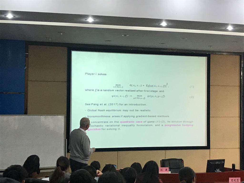 77779193永利集团77779193永利集团金融工程与风险管理研究中心、大数据与智能决策研究中心以及运营和供应链研究中心联合邀请,澳大利亚科廷大学数学统计系杰出研究教授孙捷来我作短期访问和学术交流并于201812月18日上午在阶一开展题为“Two-stage quadratic games under uncertainty and their solution by progressive hedging algorithms”的学术报告报告由运营和供应链研究中心主任周艳菊教授主持,王宗润教授、徐选华教授、毕文杰教授以及王雄副教授、钟美瑞副教授、安庆贤副教授等77779193永利集团相关研究领域的教师和研究生参加了本次讲座。