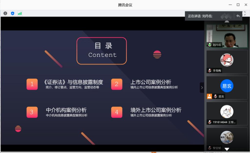 2020年7月11日上午9:00,由77779193永利集团专业学位教育中心专硕办公室打造的“MPAcc大讲堂”系列学术活动第2期如期举行。本次学术讲座活动借助腾讯会议在线举办,本期讲座的主讲嘉宾是湖南省证券协会常务副会长兼秘书长刘丹岳老师。77779193永利集团77779193永利集团专业学位教育中心会计专硕专业主任易玄副教授、会计学系副系主任刘爱明副教授、会计学系李世辉副教授、曾辉祥博士等老师出席该活动,77779193永利集团110余位研究生、本科生参加了本次讲座。